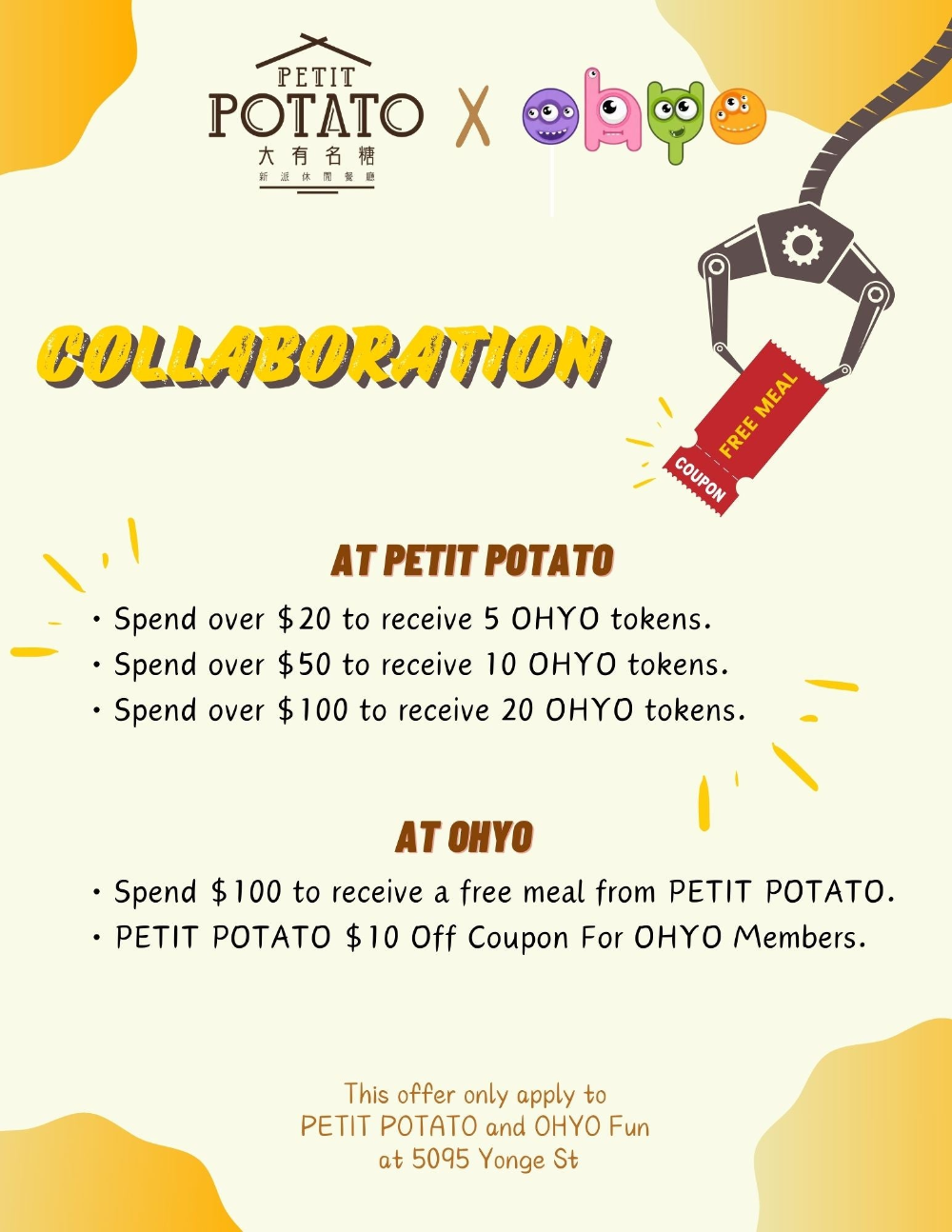 This offer only apply to PETIT POTATO and OHYO Fun at 5095 Yonge St.